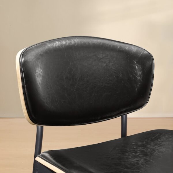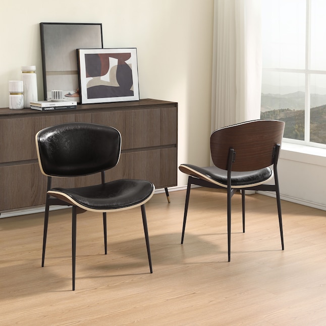 Enhance your dining room with the Hasthshilpa Art Leon 2 Contemporary Black Faux Leather Accent Chairs. This stylish set of two chairs combines sleek black faux leather with rich stained wood, creating a modern yet timeless look. Designed with both comfort and durability in mind, these chairs are perfect for everyday use or special gatherings.