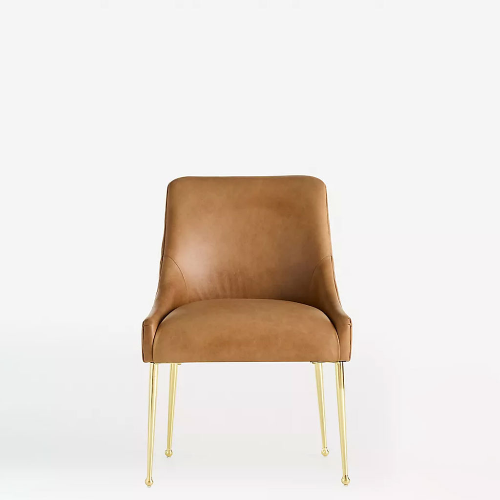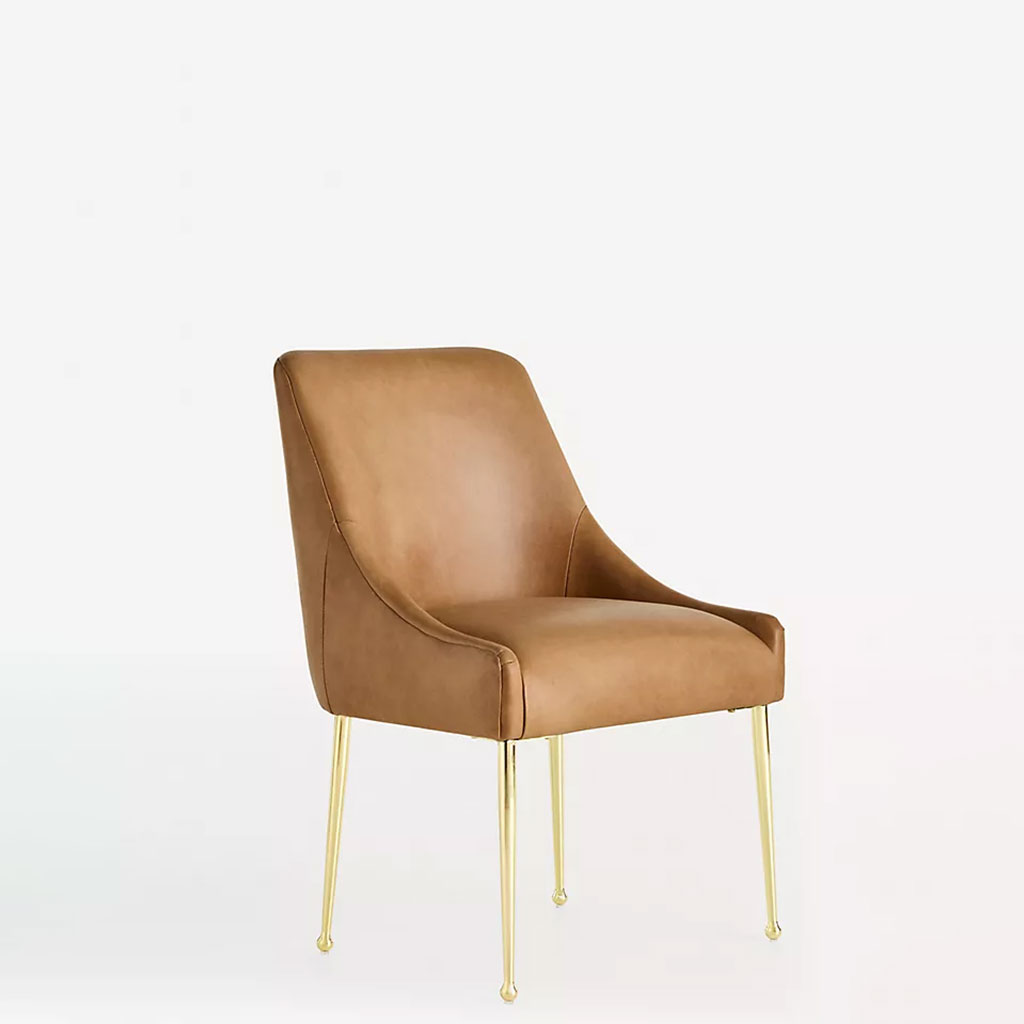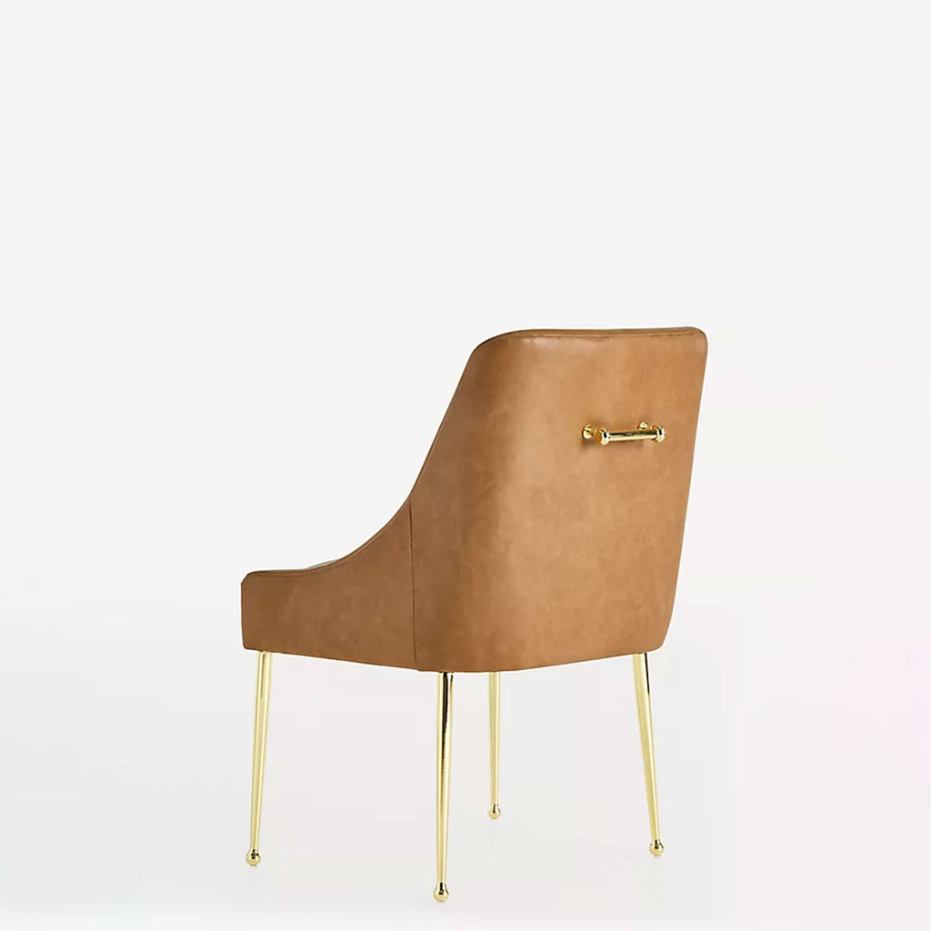 Featuring leather upholstery, polished brass legs, and a plump silhouette, this design recalls a vintage Italian classic. This slimmed-down version features an armless profile and a back brass handle.