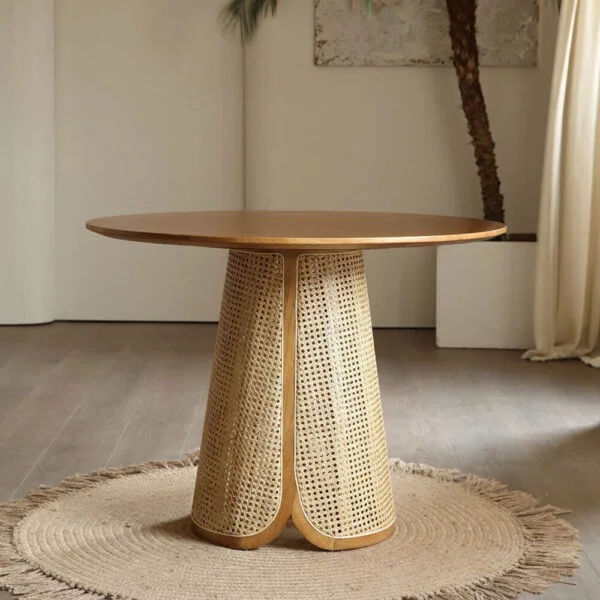 The Hasthshilpa Harmonious Design Rattan Dining Table Set is the perfect blend of style and functionality. Made from premium solid wood, this round dining set comfortably seats four, making it ideal for small to medium dining rooms. The rich stained wood finish complements any interior, while the rattan design adds a touch of natural elegance to your dining space.