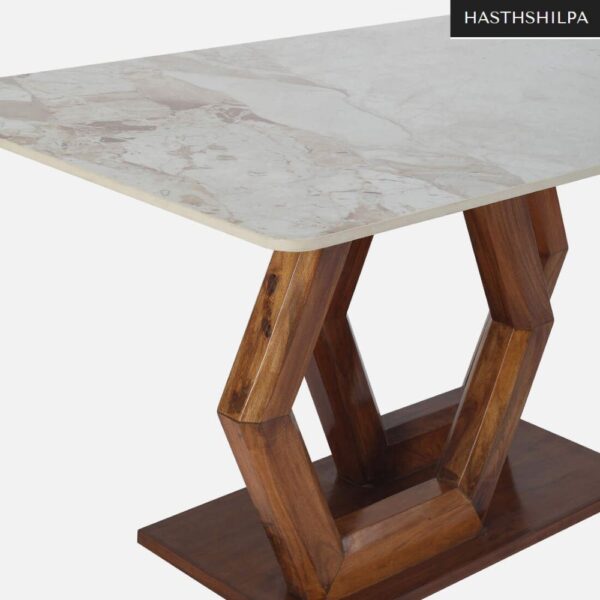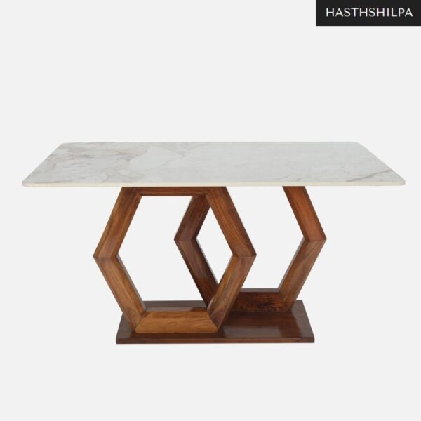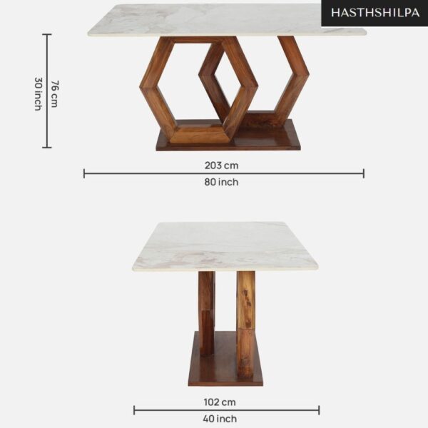 The Hasthshilpa Teakwood Ensemble with Marble 8-Seater Dining Table, a perfect blend of style, functionality, and durability. This dining table is crafted from solid wood, ensuring long-lasting quality and strength. The marble top adds a touch of sophistication and elegance, making it a great addition to your dining room furniture.
